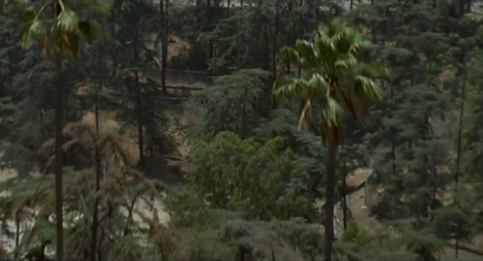 -- as the camera continues to speed over myriad tree tops -- it pans up to