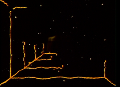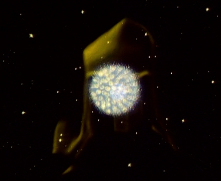 Apparently, this thing was trapped within the world of the photograph (an infinite world, Steel suggests), but the amateur conjuring of a photographer living in this very building -- the combining of a very old image with a new image inside a kaleidoscope -- has released it into our reality.