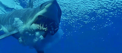 replace them, all underwater, while sharks swoop into view, lunging out from the