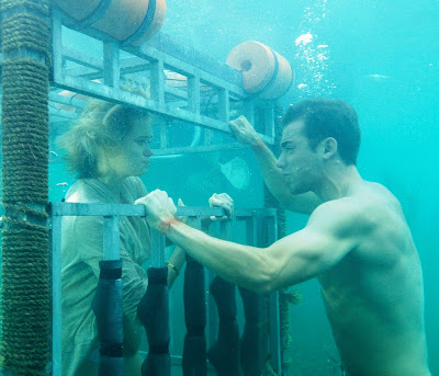 as the movie progresses, and the film’s central scenario looms --- two young women trapped in a diving cage at