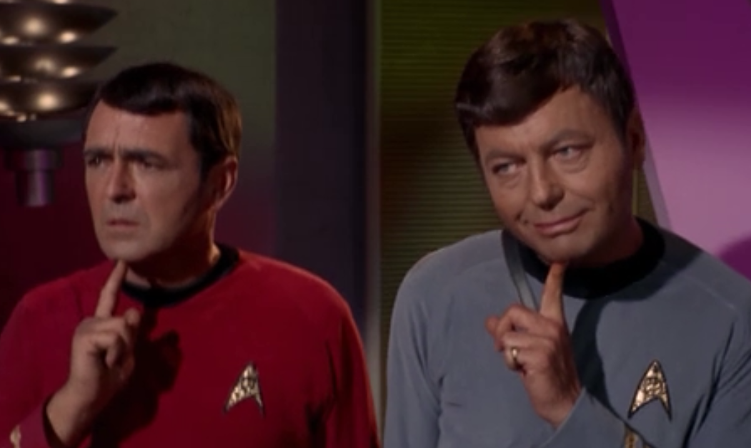 Captain Kirk has other plans, however, and along with Spock (Leonard Nimoy), Bones (DeForest Kelley), Uhura (Nichelle Nichols), Scotty (James Doohan) and Chekov (Walter Koenig) launches a campaign of “illogic” against the androids, hoping to short-circuit them.