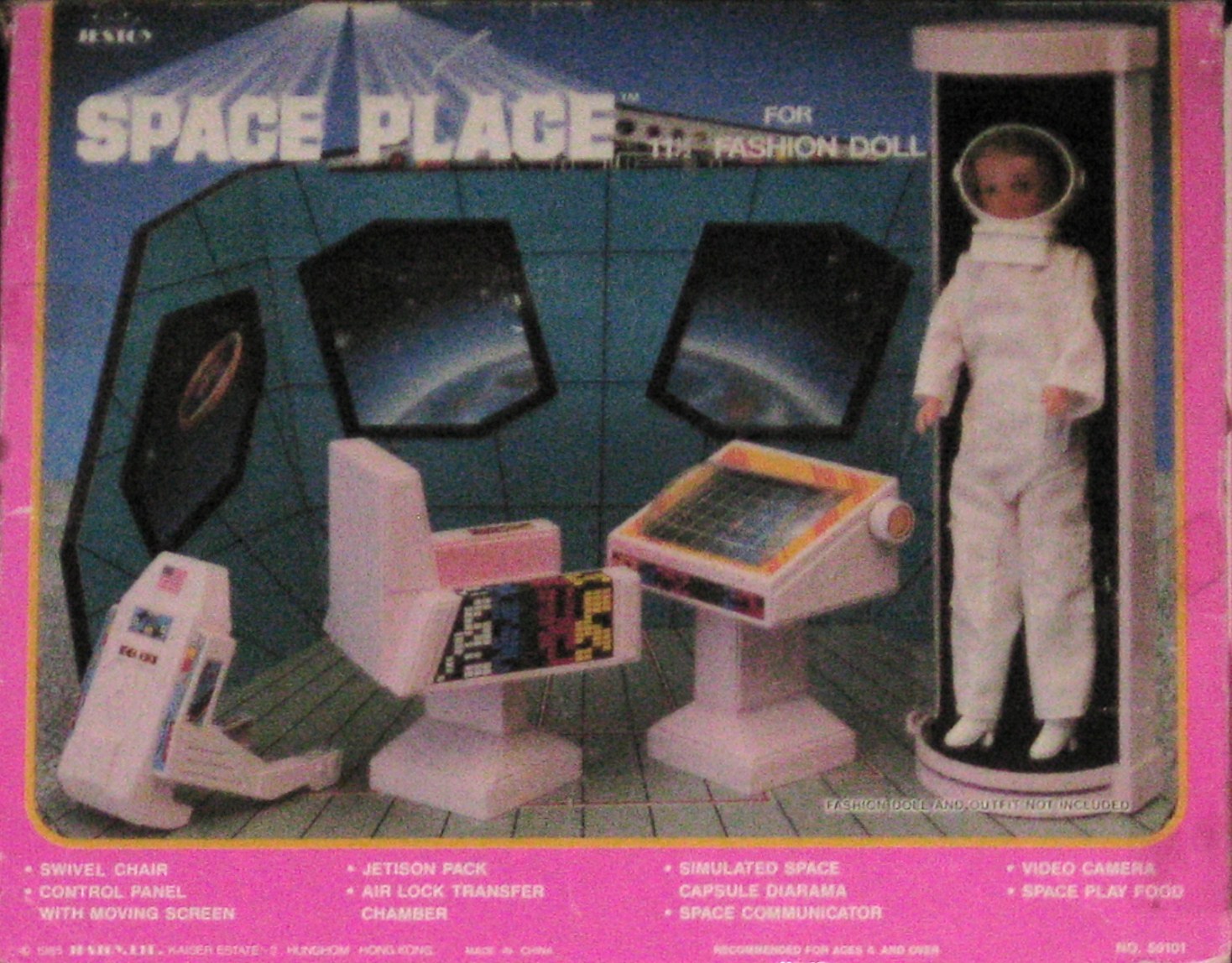 The "Space Place" is the cockpit or control deck of a spaceship, and comes with "swivel chair," "control panel with moving screen," "jetison [sic] pack," "air lock transfer chamber," "simulated space capsule diarama [sic]," "space communicator," "video camera" and even "space play food."